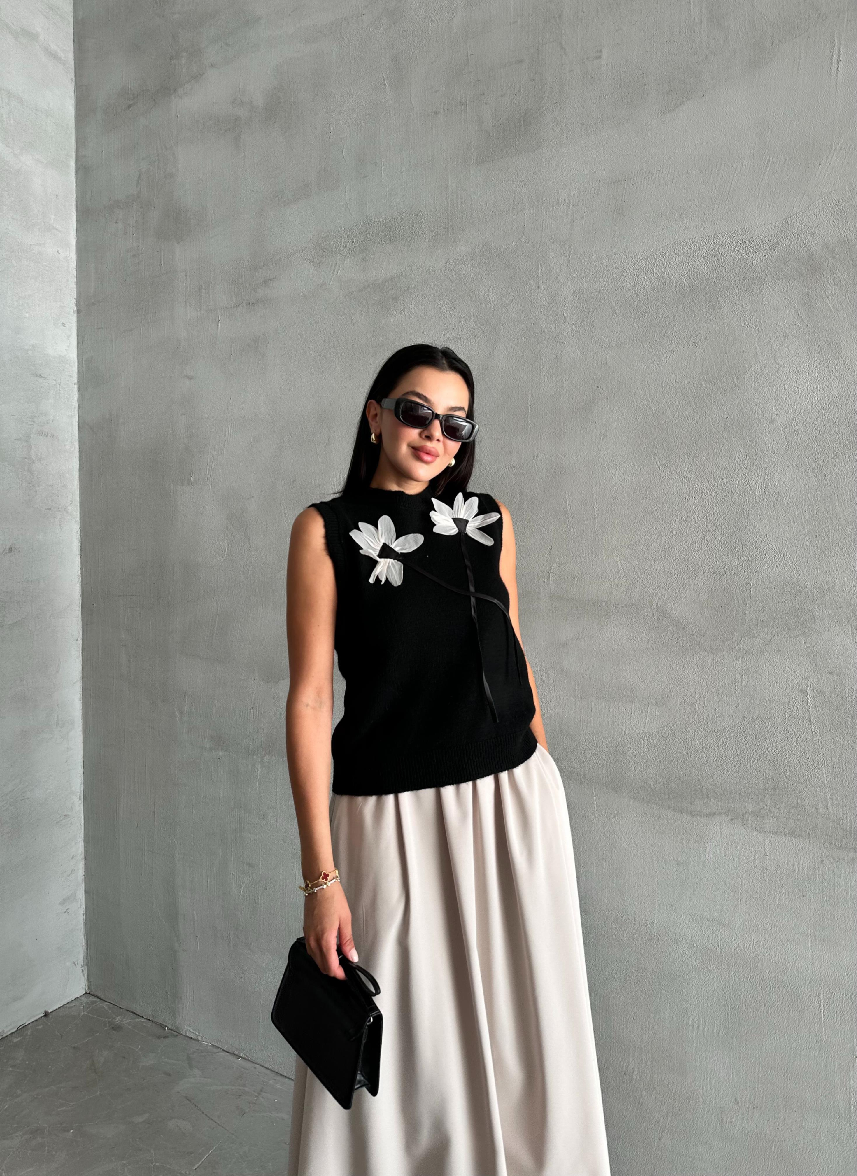 Siyah Papatya Apikeli Triko Süveter (4493-3002409300220)