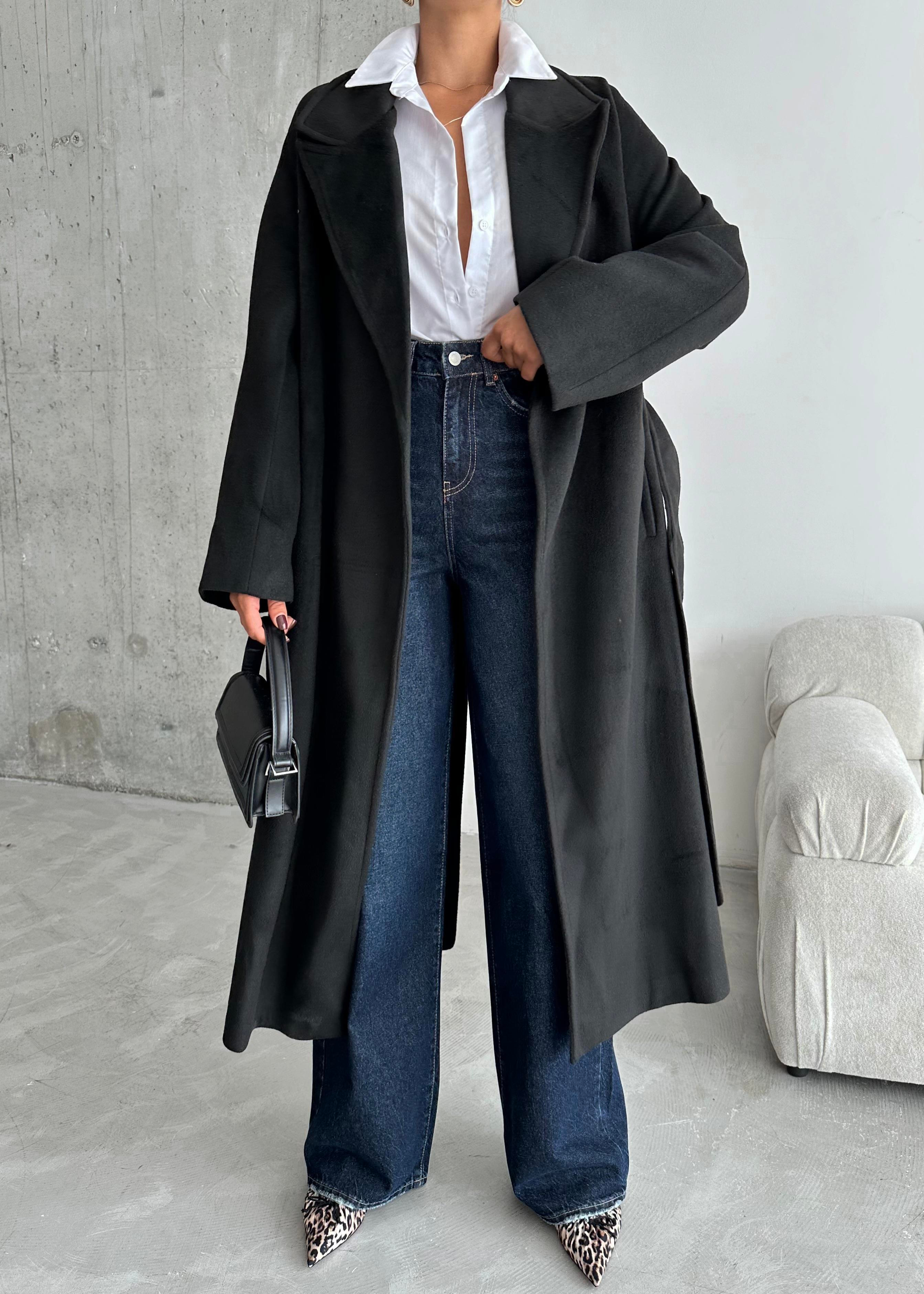 Siyah Simple Cepli Kuşaklı Uzun Kaban (542126-1608240829020)