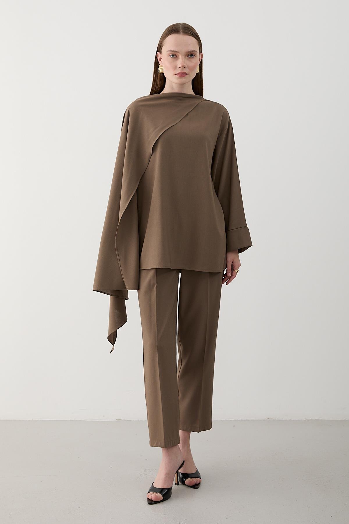 Acı Kahve Kendinden Şallı Bluz Pantolon Takım - 8752 Bordo Kendinden Şallı Bluz Pantolon Takım - 8752